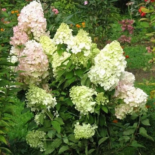 Саженцы имеют высоту 90-100 см и диаметр до 120 см. Листья этого растения имеют эллиптическую или яйцевидную форму, зеленый цвет и немного шершавую поверхность. Куст обладает декоративностью и вызывает восторг своими крупными яйцевидными соцветиями. Длина соцветия достигает 15-18 см, а диаметр цветков составляет 10-12 см. Цветки начинаются кремовыми, а к осени приобретают розовый цвет. Основная окраска цветков всегда остается белой. Цветки имеют правильную форму, их диаметр составляет 3-4 см, а лепестки – круглые. В цветке содержится 4 лепестка и слабый аромат.