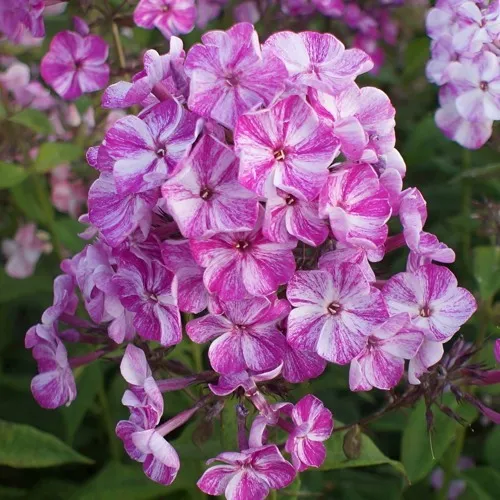Флокс метельчатый Фрекл Пёпл Шейдз это среднерослое растение, выделяющееся в саду благодаря своей привлекательности и легкости в уходе. Ланцетовидные, супротивные зеленые листья подчеркивают его элегантность и создают свежий фон для великолепия соцветий. Цветки имеют диаметр 3,5 см и достаточно крупные соцветия, которые формируются в виде красивых метелок размером до 20 см. Неповторимая окраска лепестков добавляет легкую игривость и живость вашему саду: светло-сиреневый фон изящно усеян темно-фиолетовыми крапинками, создавая эффект «веснушек», который так привлекает внимание.