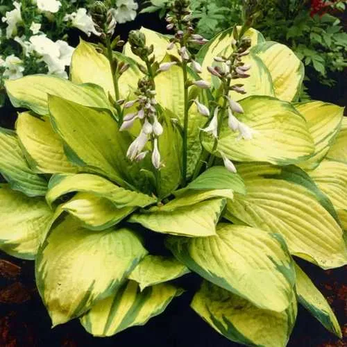 Каждый лист хосты — это произведение искусства! Кожистые, сердцевидные листья длиной до 25 см и шириной 15 см имеют невероятную текстуру: гофрированные, матовые с сизым налетом снизу. Центр листа насыщенно золотисто-желтый, элегантно обрамленный темно-зеленой полоской с плавным переходом к салатовому. Край листа остроконечный – он добавляет дополнительную изюминку в общую композицию.