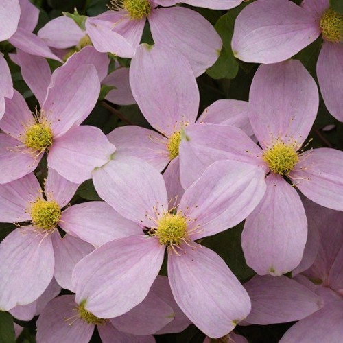 Особая ценность клематиса горного — его весеннее цветение. На прошлогодних побегах распускаются сотни или даже тысячи звёздчатых цветков диаметром 4–7 см. Лепестки тонкие, почти прозрачные, создают эффект лёгкости и воздушности. В России пик цветения приходится на конец мая — начало июня, и длится до четырёх недель. Цветы покрывают всю лиану словно облако: бледно-розовые оттенки образуют мягкую, гармоничную гамму. Некоторые сорта выделяются лёгким сладким ароматом, который приятно ощущается вблизи, особенно в солнечные утренние часы. Цветение настолько обильно, что лиана полностью скрывает опору, превращая её в декоративный элемент садовой композиции. После основного периода отдельные цветки могут появляться ещё некоторое время, создавая эффект лёгкой повторной волны цветения.